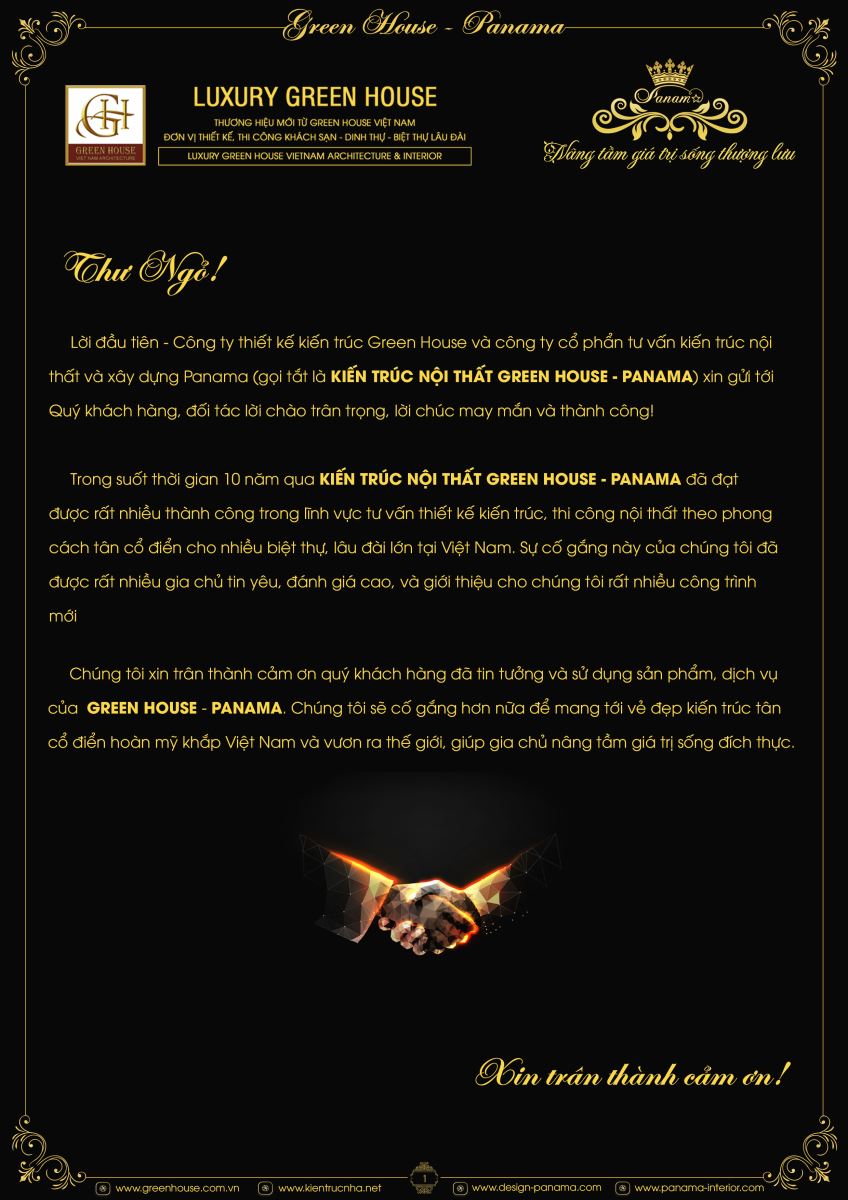 Công ty thiết kế kiến trúc Green House và công ty cổ phần tư vấn kiến trúc nội thất nội thất và xây dựng Panama ( gọi tắt là KIẾN TRÚC NỘI THẤT GREEN HOUSE - PANAMA ) được hình thành dựa trên sự kết hợp tuyệt vời giữa các kiến trúc sư giàu kinh nghiệm cùng với các chuyên viên thiết kế, chuyên viên kỹ thuật được đào tạo chuyên môn cao. Sự đồng hành hợp tác đó là tâm huyết của tập thể làm việc nghiêm túc với những “đứa con tinh thần” đáng quý và hướng đến mục đích cuối cùng là làm cho chủ đầu tư thực sự cảm thấy hài lòng, thích thú; vừa mãn nhãn về mặt thị giác, vừa phải mang lại trải nghiệm có chiều sâu, một trải nghiệm đẳng cấp, khác biệt, xứng đáng với nhu cầu thưởng thức đỉnh cao.