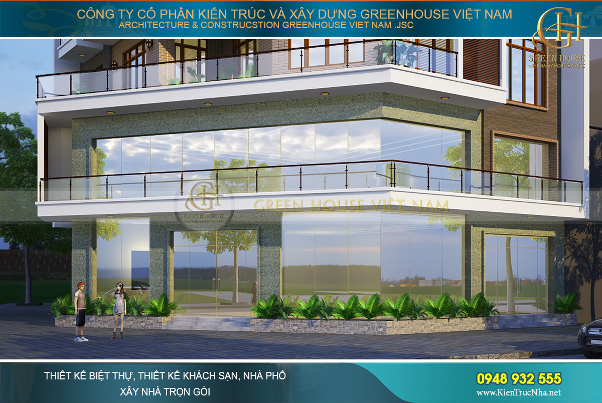 Các KTS Green House Việt Nam cũng rất tôn trọng sự điều tiết các yếu tố tự nhiên trong ngôi nhà, chính vì thế nên rất nhiều cây xanh được bố trí ở các góc ngoài không gian của ngôi nhà. Vì là thiết kế biệt thự kết hợp kinh doanh nên việc có một ngoại thất tốt, đẹp và sang trọng cũng được chú ý, sử dụng vật liệu kính tạo nên sự sang trọng cho không gian kinh doanh của gia chủ, tầng 1 được thiết kế với trần cao thoáng làm cho không gian kinh doanh trở nên rộng rãi, hút khách hơn.